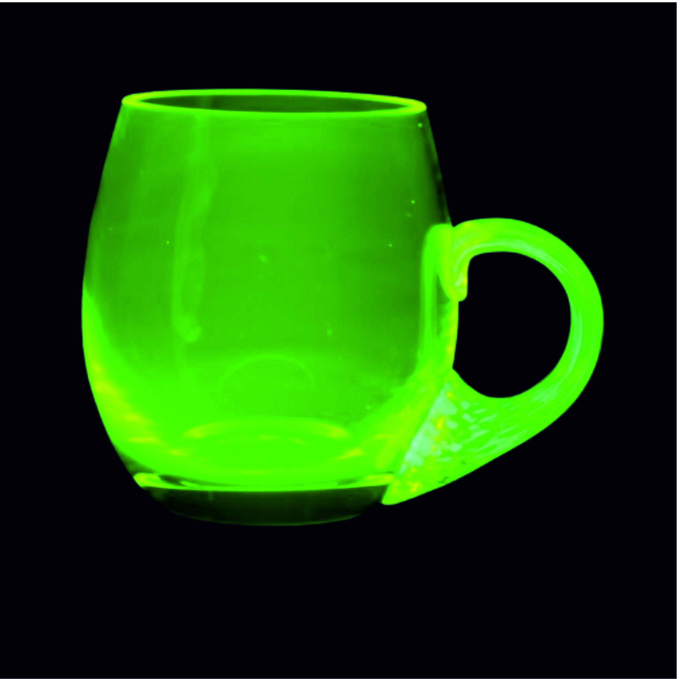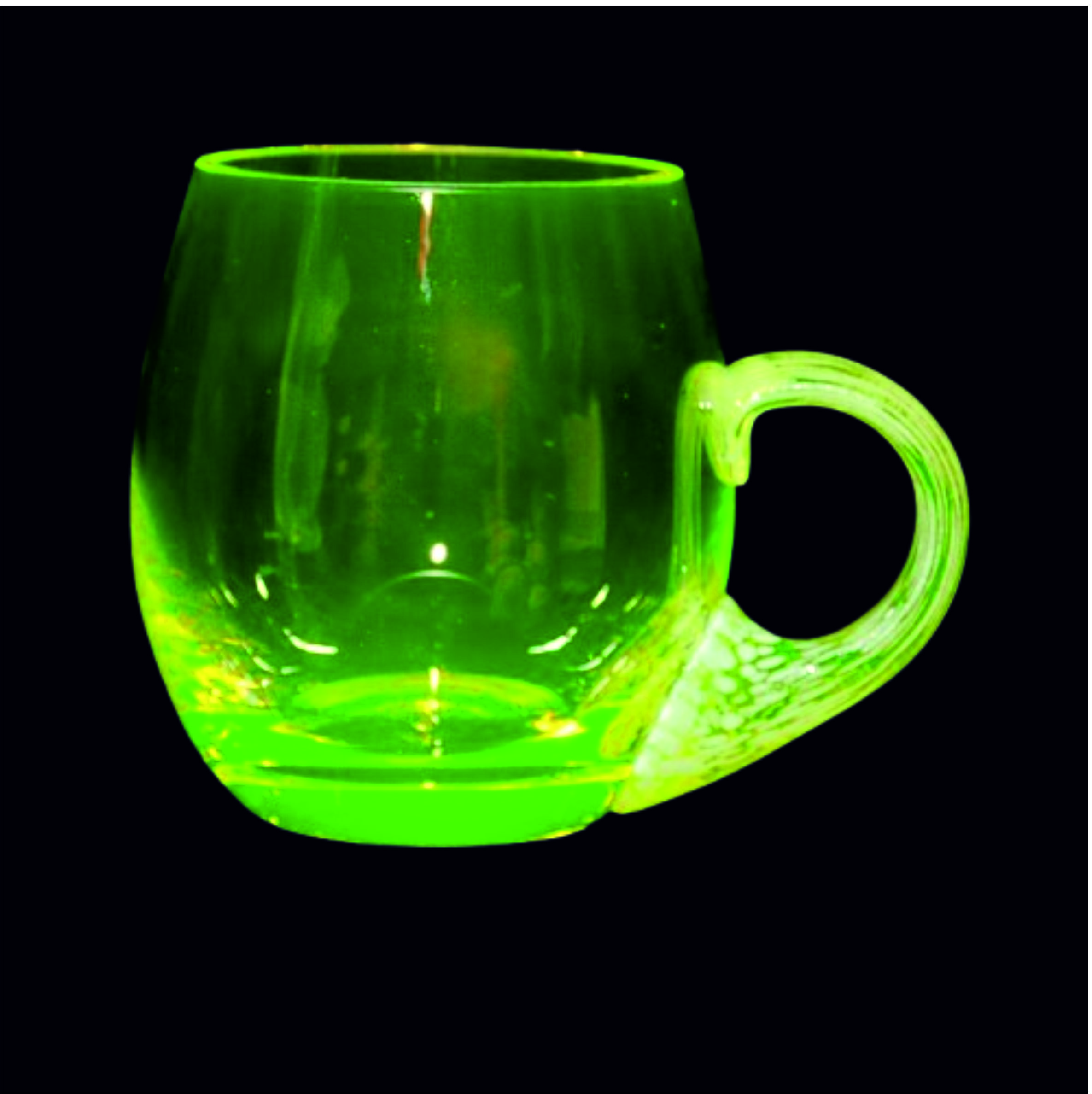 Fluorescentní půllitr z uranového skla s uchem s dlouhým dosvitem.